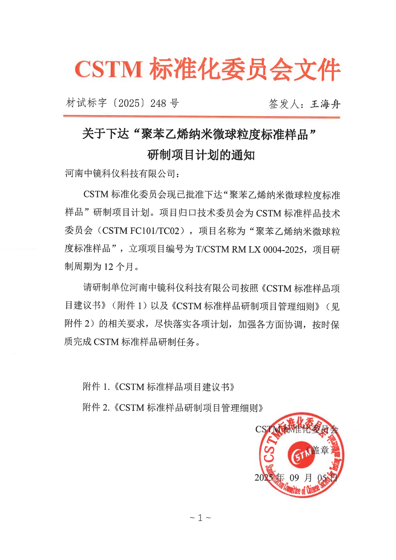 祝賀中鏡科儀 在CSTM首批標(biāo)準(zhǔn)樣品研制項(xiàng)目 立項(xiàng)論證會中成功立項(xiàng)! 近日,CSTM標(biāo)準(zhǔn)化委員會傳來消息,在首批標(biāo)準(zhǔn)樣品研制項(xiàng)目立項(xiàng)論證會上,河南中鏡科儀科技有限公司申報(bào)的“聚苯乙烯納米微球粒度標(biāo)準(zhǔn)樣品”項(xiàng)目,經(jīng)過評審,成功獲得立項(xiàng)(項(xiàng)目編號:T/CSTM RM LX 0004-2025)。 該項(xiàng)目隸屬于CSTM標(biāo)準(zhǔn)樣品技術(shù)委員會(CSTM FC101/TC02),其立項(xiàng)既是對中鏡科儀在納米材料標(biāo)準(zhǔn)化領(lǐng)域研究實(shí)力的權(quán)威認(rèn)可,也是對公司長期以來致力于標(biāo)準(zhǔn)化工作的肯定。項(xiàng)目計(jì)劃周期為12個(gè)月,研制期間將嚴(yán)格遵循《CSTM標(biāo)準(zhǔn)樣品項(xiàng)目建議書》及《CSTM標(biāo)準(zhǔn)樣品研制項(xiàng)目管理細(xì)則》的要求,確保各項(xiàng)研制工作科學(xué)、規(guī)范、高效推進(jìn)。 此次“聚苯乙烯納米微球粒度標(biāo)準(zhǔn)樣品”的研制,將為納米材料的粒度分析提供準(zhǔn)確、可靠的參照標(biāo)準(zhǔn),有助于提升我國納米材料產(chǎn)業(yè)的整體質(zhì)量水平,促進(jìn)相關(guān)產(chǎn)業(yè)的發(fā)展。 未來,中鏡科儀將持續(xù)提升技術(shù)實(shí)力與市場競爭力,為我國標(biāo)準(zhǔn)化事業(yè)發(fā)展貢獻(xiàn)更多力量,有望在標(biāo)準(zhǔn)化領(lǐng)域?qū)崿F(xiàn)更多創(chuàng)新與突破。