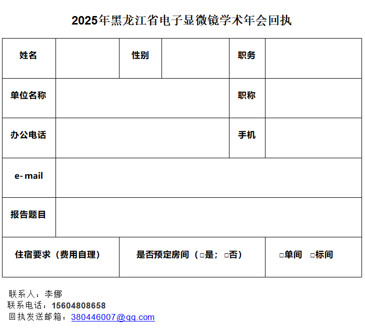 2025年黑龍江省 電子顯微鏡年會(huì) ——第二輪通知—— 為推動(dòng)掃描電鏡、雙束電鏡、透射電鏡及原位系統(tǒng)等在我省材料、生物、化工等學(xué)科領(lǐng)域的技術(shù)應(yīng)用與發(fā)展,同時(shí)增進(jìn)本領(lǐng)域各行業(yè)眾多用戶的交流與合作,達(dá)成我省電鏡技術(shù)科技人員的信息共享,提升我省電鏡技術(shù)科技人員在該領(lǐng)域的專(zhuān)業(yè)技術(shù)能力與應(yīng)用水平,黑龍江省電子顯微鏡年會(huì)擬定于2025年12月12日召開(kāi)。 會(huì)議將邀請(qǐng)我省本領(lǐng)域知名科學(xué)家、研究學(xué)者和工程師就電子顯微鏡技術(shù)及其在材料科學(xué)、生命科學(xué)、物理學(xué)、化學(xué)化工、環(huán)境科學(xué)等領(lǐng)域中的基礎(chǔ)研究和應(yīng)用研究,以及電鏡及其它顯微學(xué)儀器的使用、改進(jìn)與維修經(jīng)驗(yàn)等最新進(jìn)展做大會(huì)報(bào)告。同時(shí),會(huì)議還將邀請(qǐng)?jiān)O(shè)備相關(guān)廠商做電鏡及其相關(guān)設(shè)備的最新發(fā)展介紹和產(chǎn)品展示。 一、主辦單位 黑龍江省物理學(xué)會(huì)電子顯微鏡專(zhuān)業(yè)委員會(huì) 二、協(xié)辦單位 哈爾濱工業(yè)大學(xué) 哈爾濱工程大學(xué) 哈爾濱理工大學(xué) 哈爾濱紫貝科技有限公司 黑龍江省全慧科技有限公司 三、會(huì)議主要內(nèi)容 1、透射電鏡、掃描電鏡、雙束電鏡及原位系統(tǒng)等在相關(guān)學(xué)科領(lǐng)域的應(yīng)用; 2、電鏡及相關(guān)儀器的使用、改進(jìn)與維修經(jīng)驗(yàn)交流; 3、電鏡、制樣及相關(guān)儀器、耗材廠商的最新產(chǎn)品介紹。 四、會(huì)議日程安排(2025年12月11日~12月12日) 會(huì)議地點(diǎn)(哈爾濱市和興路81號(hào)美居酒店),并請(qǐng)各位老師、同學(xué)、廠商把參會(huì)回執(zhí)發(fā)至: 380446007@qq.com 五、會(huì)議費(fèi) 本次會(huì)議不收取會(huì)議費(fèi)。食宿自理。 六、會(huì)務(wù)組及聯(lián)系人 魏大慶:13796665111 鄒永純:15045082576 李娜:15604808658 全慧科技:15846508138 黑龍江省物理學(xué)會(huì)電子顯微鏡專(zhuān)業(yè)委員會(huì) 2025年10月21日