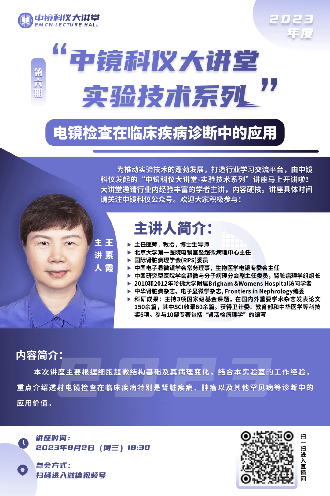 由中鏡科儀發(fā)起的2023年“中鏡科儀大講堂”第六期-“實(shí)驗(yàn)技術(shù)系列”講座將于2023年8月2日18:30開講。本期由王素霞教授帶來的《電鏡檢查在臨床疾病診斷中的應(yīng)用》專題講座將結(jié)合多年來在臨床診斷和科研工作中的經(jīng)驗(yàn),詳盡地講解電鏡技術(shù)在臨床疾病診斷中的應(yīng)用價(jià)值。歡迎大家積極參與,共同推動(dòng)實(shí)驗(yàn)技術(shù)的發(fā)展! 講座時(shí)間: 2023年8月2日(周三)18:30 參會(huì)方式: 掃碼進(jìn)入微信視頻號(hào)