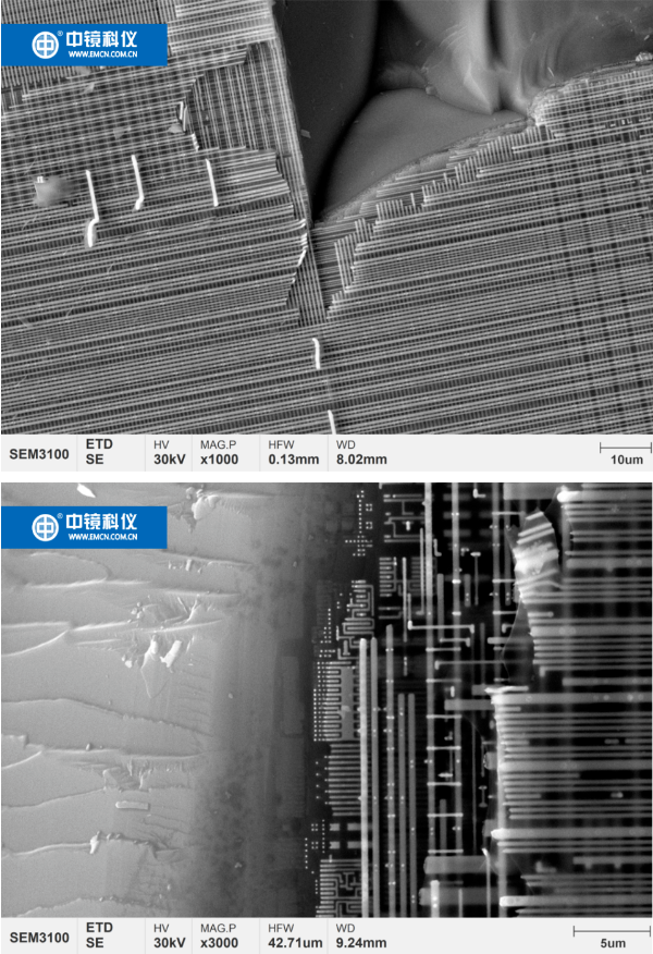 近日,國內(nèi)芯片行業(yè)喜報連連,8月29日,華為搭載麒麟9000S芯片的Mate 60 Pro正式上線,該芯片上行峰值網(wǎng)速可以達到5G標準。標志著華為突破1079天封鎖!麒麟芯片正式回歸。8月30日中國移動宣布,國內(nèi)首款商用可重構5G射頻收發(fā)芯片“破風8676”研制成功。 電子顯微鏡被廣泛應用于芯片設計、制造和分析,芯片設計者可以通過SEM深入了解芯片內(nèi)部結(jié)構,優(yōu)化電路布局和排線方式,提高電路的性能和功耗比,觀察和分析微小缺陷和結(jié)構變化從而有效提高了芯片的可靠性和穩(wěn)定性,為芯片研發(fā)人員提供了重要的數(shù)據(jù)支持。 下面我們就隨著電子顯微鏡的視野走進納米尺度下芯片的世界: 本次選取了Intel奔騰4524(90nm制程)和Intel奔騰雙核E6600(45nm制程)和晶圓,利用掃描電子顯微鏡(SEM)進行了觀察。 首先,晶圓放大50倍后,可以看到整整齊齊地排列著數(shù)不盡器件和導線就像一座星羅密布的城池里面縱橫交錯的街道。 晶圓放大1000倍,可以看到一個個器件整齊排列,正如城池內(nèi)一個個建筑物。 cpu芯片放大了1000倍和3000倍,可以看到內(nèi)部的導線整齊地排列,像一條條復雜的高架橋,連接cpu內(nèi)各個部件。 放大5000倍,可以看到cpu芯片內(nèi)部有多個分層,而且每層連線的線徑、間距、走向均不一致,隨著層數(shù)越深線徑、間距越小。 放大到10000倍,可以看到最下層的部件,對比這兩款cpu,可以明顯看出Intel奔騰雙核E6600比Intel奔騰4524精細得多,經(jīng)過測量,分別為47納米和95nm,與制程參數(shù)基本一致。 芯片被譽為是人類智慧的“結(jié)晶”,看起來很小,但內(nèi)部結(jié)構極為復雜,對于人類的各個方面生活都有著深遠的影響和價值,電子顯微鏡和芯片一樣,同屬于“卡脖子”技術,此次芯片的突破為我們注入一劑強力劑,只要我們牢牢抓住科技創(chuàng)新的“牛鼻子”,相信在不遠的將來,“卡脖子”技術將被我們一一突破。 回頭望,中國芯道阻且長終破浪, 往前看,電鏡夢行而不輟看東方。 編寫:趙勝藍 攝影:郭 珊 制作:李慧芳 審核:王 萍 校對:李鳳麗、殷 雪